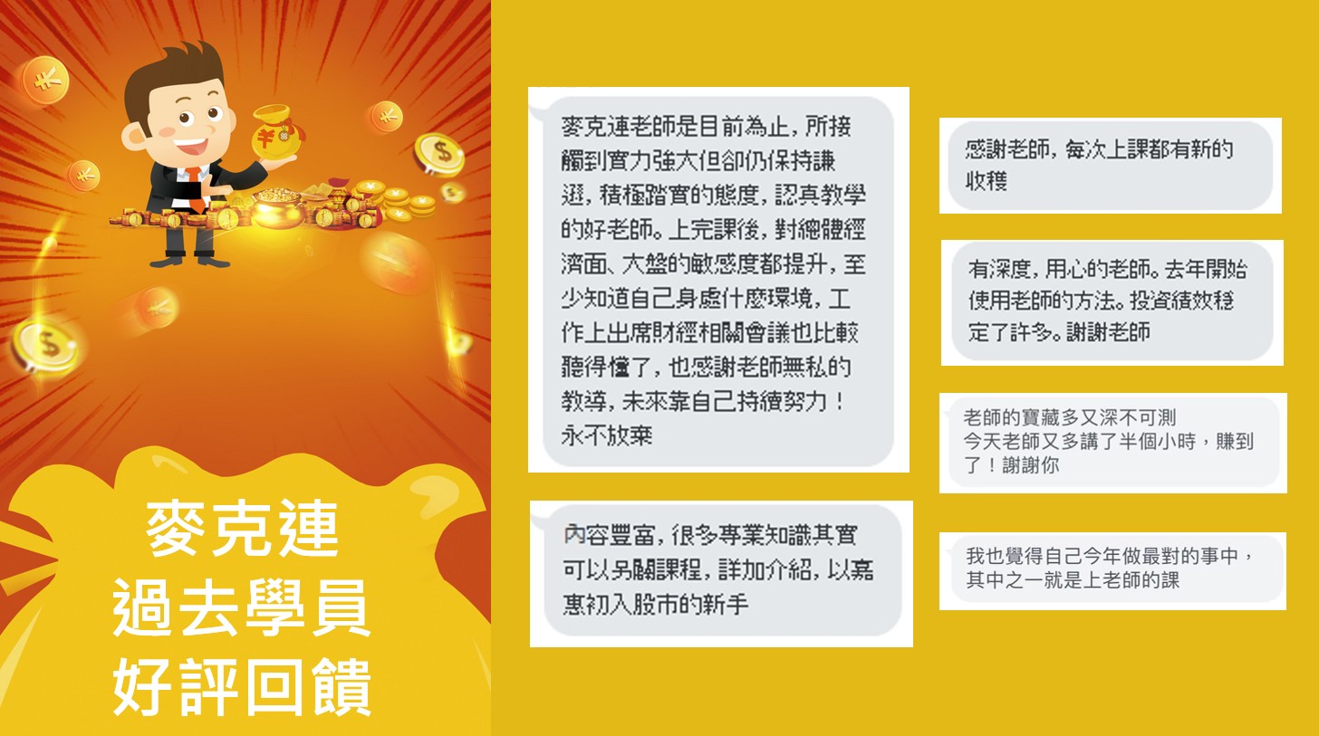 麥克連著有「小散戶這樣追籌碼賺1億」、「追籌碼賺1億(2)--麥克連教你挑選會飆的法人認養股」兩本著作,也在大學社團、社區大學、各大財經媒體演講及授課,因應美國新總統川普上任,以及開始步入升息循環,全球景氣轉趨向上,如何利用籌碼判別大盤趨勢,如何挑選優質股票及買賣切入點,並特別針對利用景氣循環的長線股標的選擇,在課程中會有詳細清楚的解說。