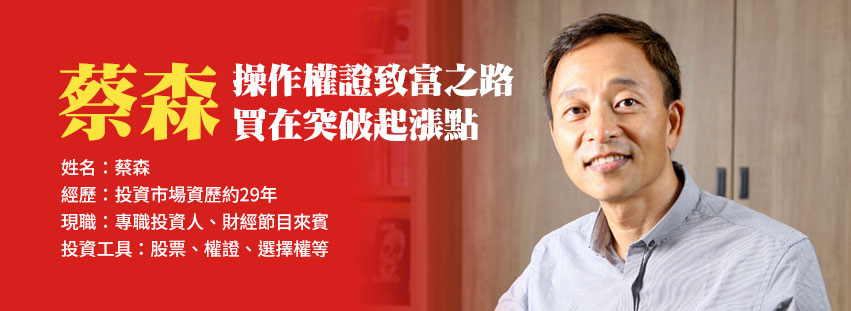 「做任何投資都要趨勢形成再進場,成功機率會非常高。」蔡森靠著技術分析波段操作,懂得在趨勢形成時善用槓桿工具,40歲就獲利數千萬元,達到財富自由,提早退休,他當年就是把20%資金放在權證,看到突破才進場,設好停損點就可達到大賺小賠的致富之路。