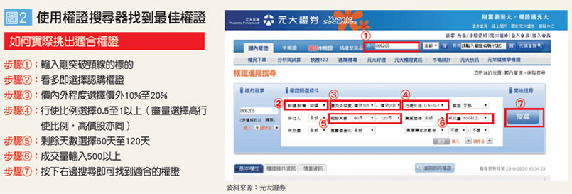 上證指數在台灣掛牌的ETF有富邦投信發行的FB上証180(006205)ETF,此時可以利用元大權證網(圖2),在標的欄輸入006205,依蔡森4條件篩選,就可以挑選適合的權證介入。