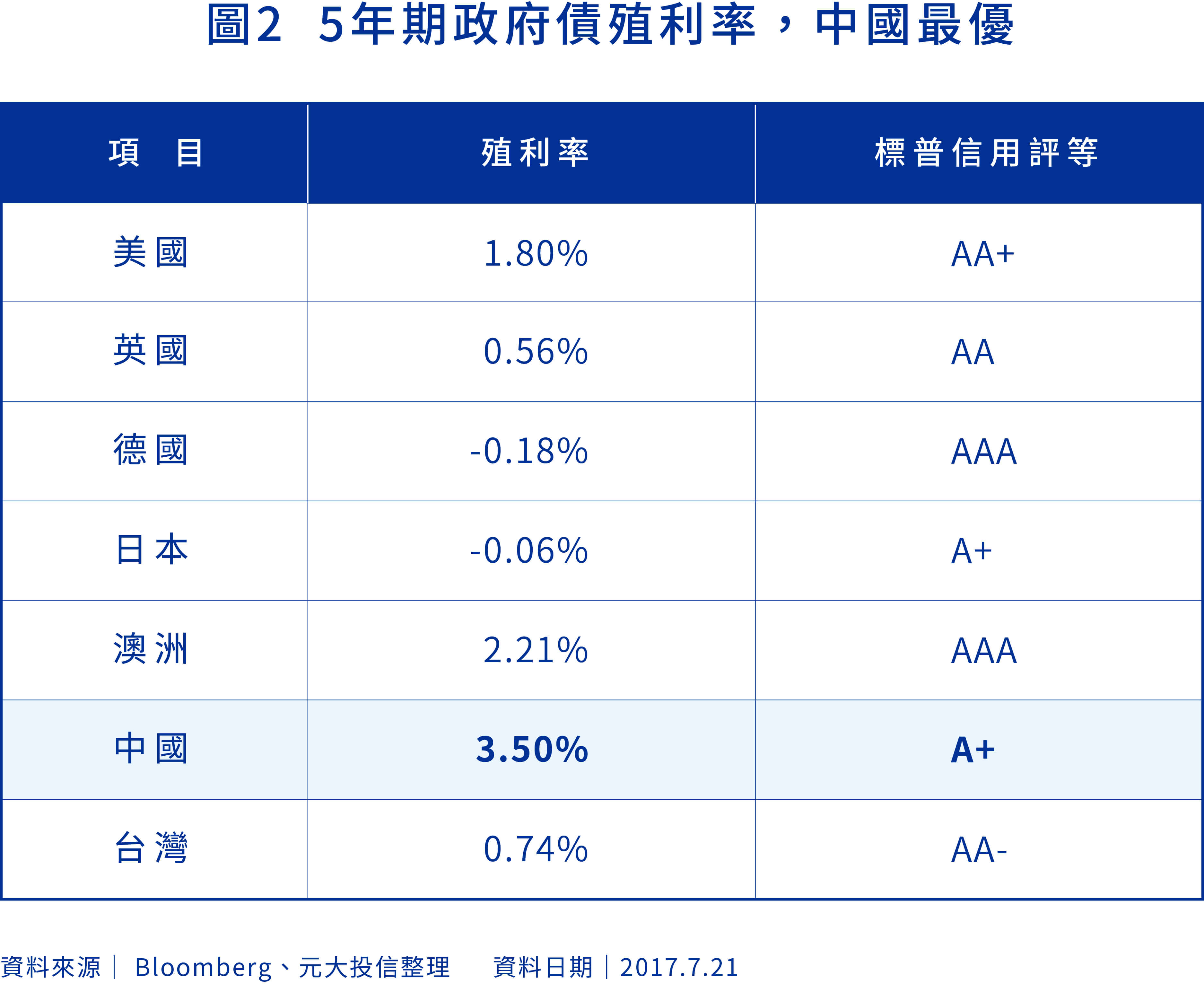 根據國際清算銀行統計至2017年6月底,中國是僅次於美國、日本,全球排行第三大的債券市場,規模達9.4兆美元。另外,中國政府信評為A+,與歐美已開發國家相當,但卻有較高的債券殖利率,對於資產配置的投資人而言,可作為長期的投資參與。