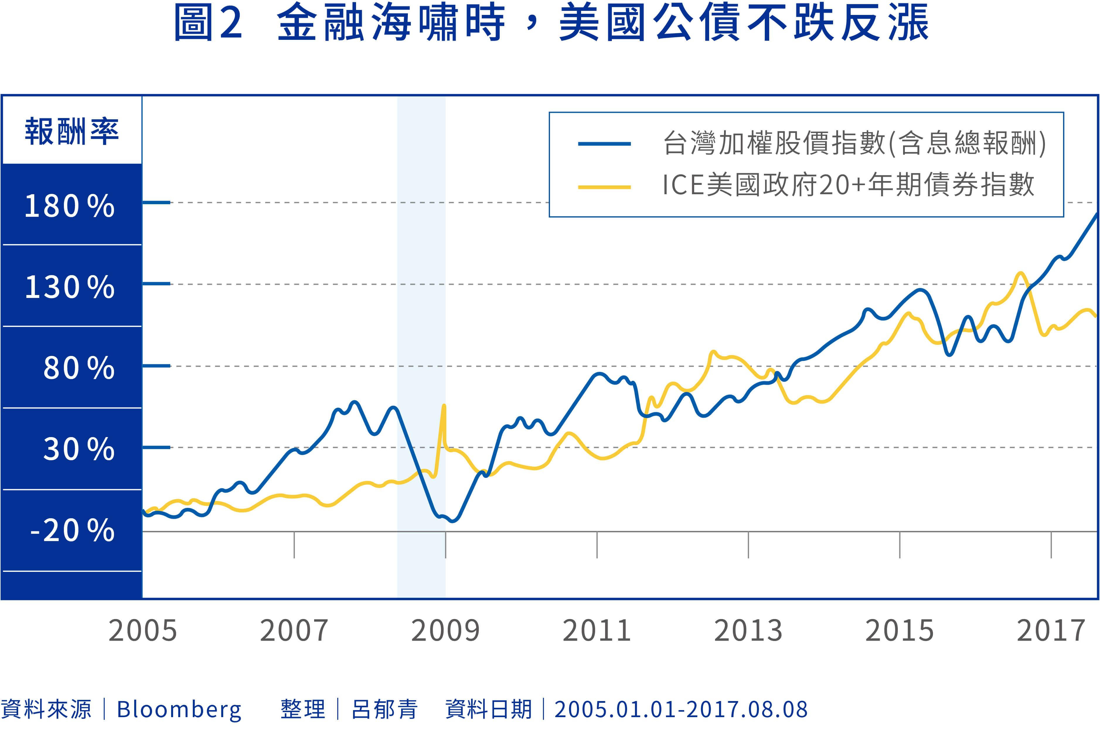 若從2005年以來,投資台股與美國長天期政府公債各持有50%,累積報酬率可達147%,年化報酬率可達8%。假如遇到2008年的金融海嘯,台股大盤幾乎是跌掉6成,若將所有資產重壓在股票,停損很可能會砍在低點,但若有50%資金配置在美國政府公債,就算遇到2008年股災時反而會大漲(圖2),減少整體資產波動度。