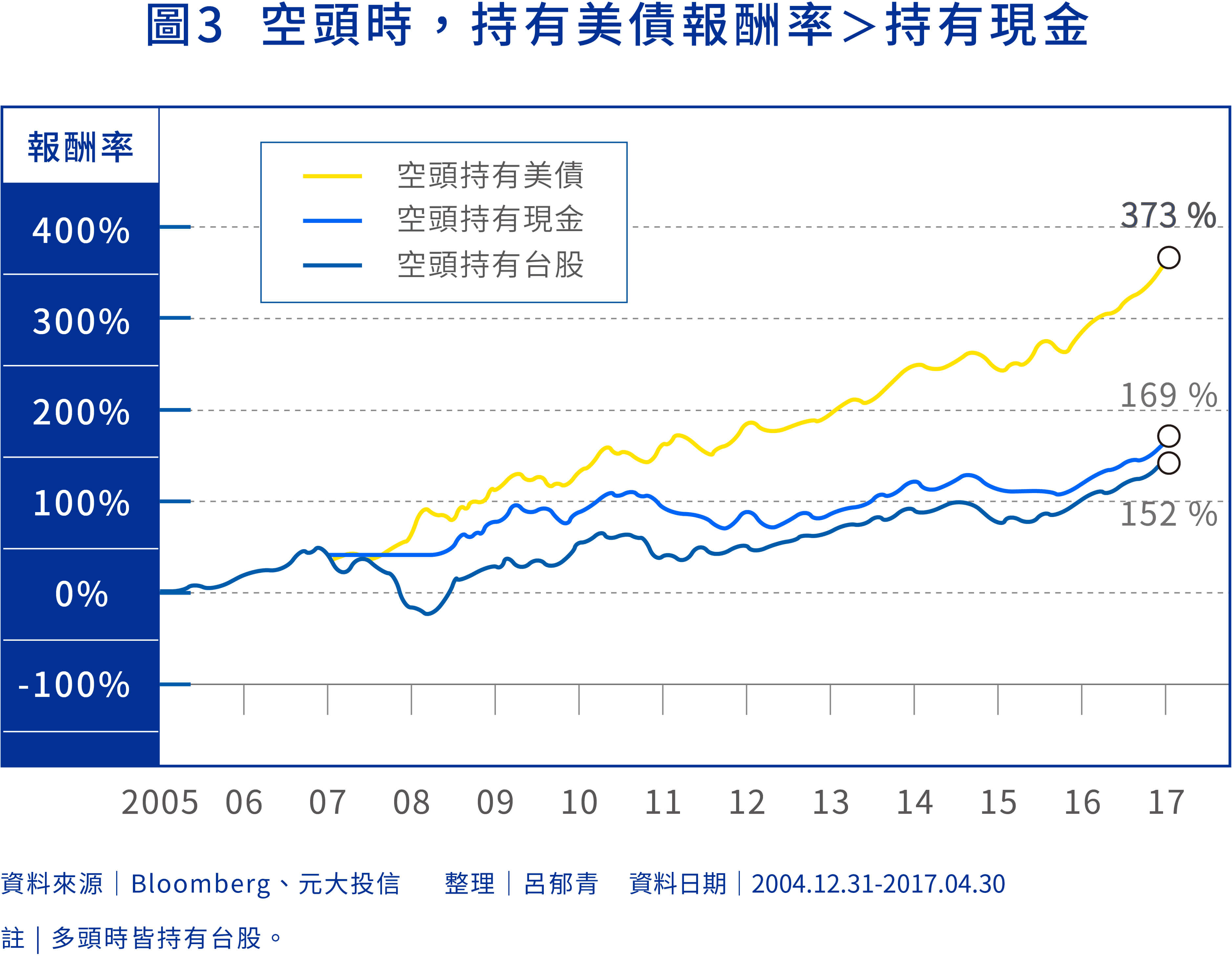 張勝原表示,利用年線作為台股多空的分野,當台股加權指數在年線以上就視為多頭,可持有股票;當台股加權指數在年線以下,則視為空頭,改持有美債或是現金。試算從2005年初至2017年4月,空頭時改持有美債的報酬率為373%,比持有現金的報酬率169%高出一倍多,但若一直持有股票,報酬率則為最低的152%(圖3)。