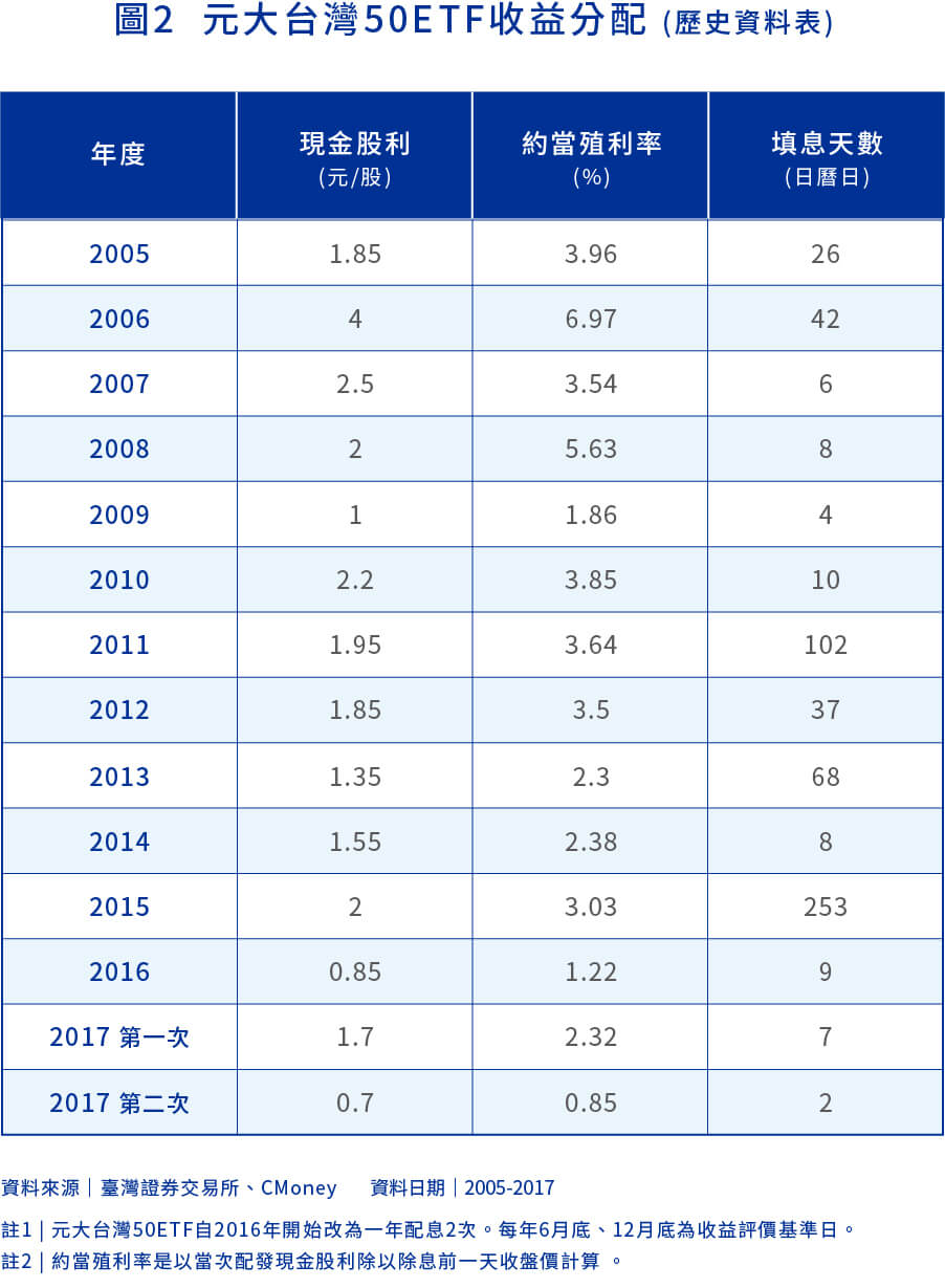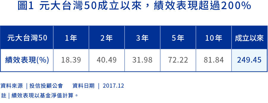 元大台灣50ETF(0050)近日公告收益分配,預定將配發2.2元現金股利,將於1/29進行除息。元大台灣50ETF自2003年成立以來,績效表現達249.45%(圖1),過去績效表現毫不遜色於台股基金平均表現,兼具息收、價差雙重效益,符合投資人退休理財需求,目前台股屢創新高的走勢下,建議投資人不妨透過定期定額方式,中長期投資。