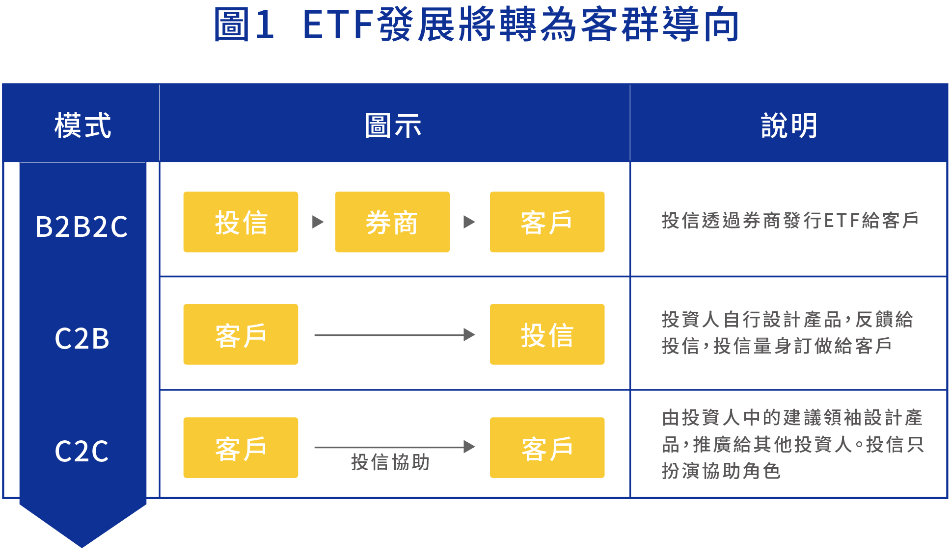 例如很多金融機構告訴我們,他們希望能有「低波動、高股息」的ETF商品,我們就量身訂製這樣類型的產品給他們。我們希望接下來更多發展「消費者參與的商業模式」,最後甚至收斂到C2C(個人對個人的消費模式),C2C就是變成客群導向(圖1)。現在有很多投資者儼然是意見領袖;又或者像所謂的機器人理財,客戶可透過既有的工具或一些模擬,自己創造出符合自己需求的投資組合,等於是自己當基金經理人。